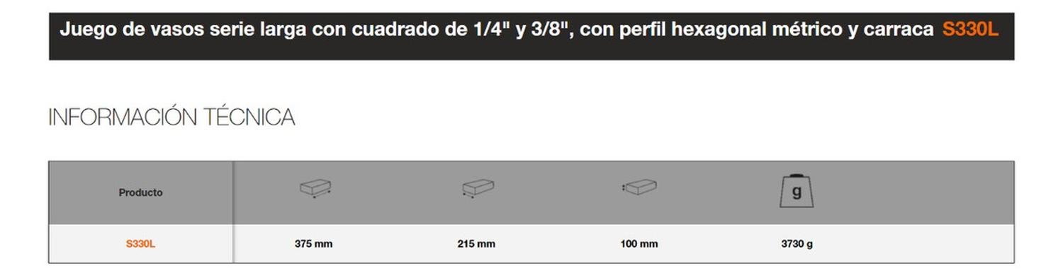 JUEGO DE 53 HERRAMIENTAS DADOS 3/8 Y PUNTAS 1/4 S330L BAHCO- Juego de 12 vasos hexagonales de 3/8": 10, 11,... Leer más...